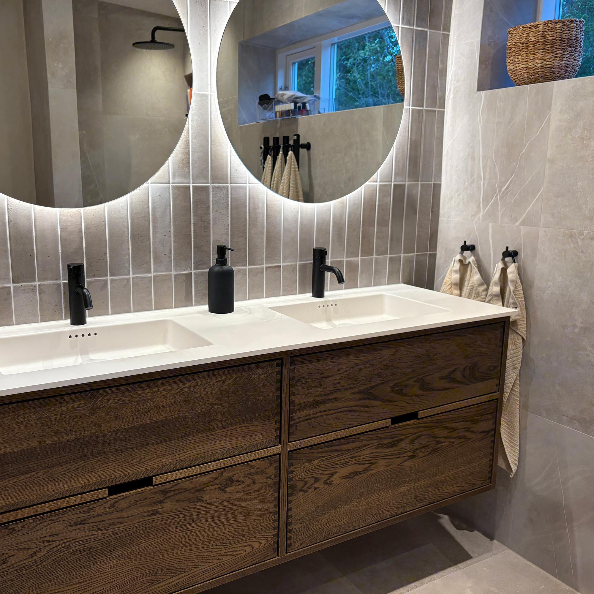 Dette snedker badmøbel har 4 skuffer og har dobbelt vask. Badmøblet er fremstillet med massive, olierede og fingertappede træskuffer i egetræ med flotte detaljer. Skufferne er lavet med fuldudtræk samt softluk og kommer med vaskeudskæring i øverste skuffe og fuld dybde i den nederste skuffe.