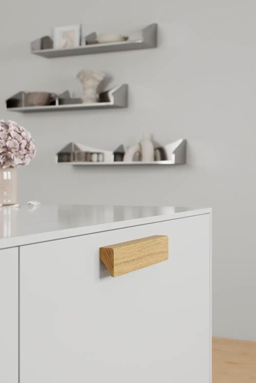 Baum udforsker balancen mellem taktilitet og form. Det blødt buede greb ligger naturligt i hånden, mens den plane frontflade lader træets naturlige struktur træde frem. Samspillet mellem stram geometri og blid formgivning giver Baum en stille styrke – en arkitektonisk tilstedeværelse med et menneskeligt præg.