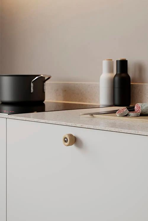 Nola er en moderne fortolkning af de klassiske møbelknopper, der traditionelt blev monteret forfra. Designet trækker på vintage-referencer, hvor synlige skruer var en praktisk og ærlig løsning — her genfortolket som et bevidst designelement. Med sine bløde kurver og kompakte proportioner tilbyder Nola et behageligt greb og et venligt, taktilt udtryk.