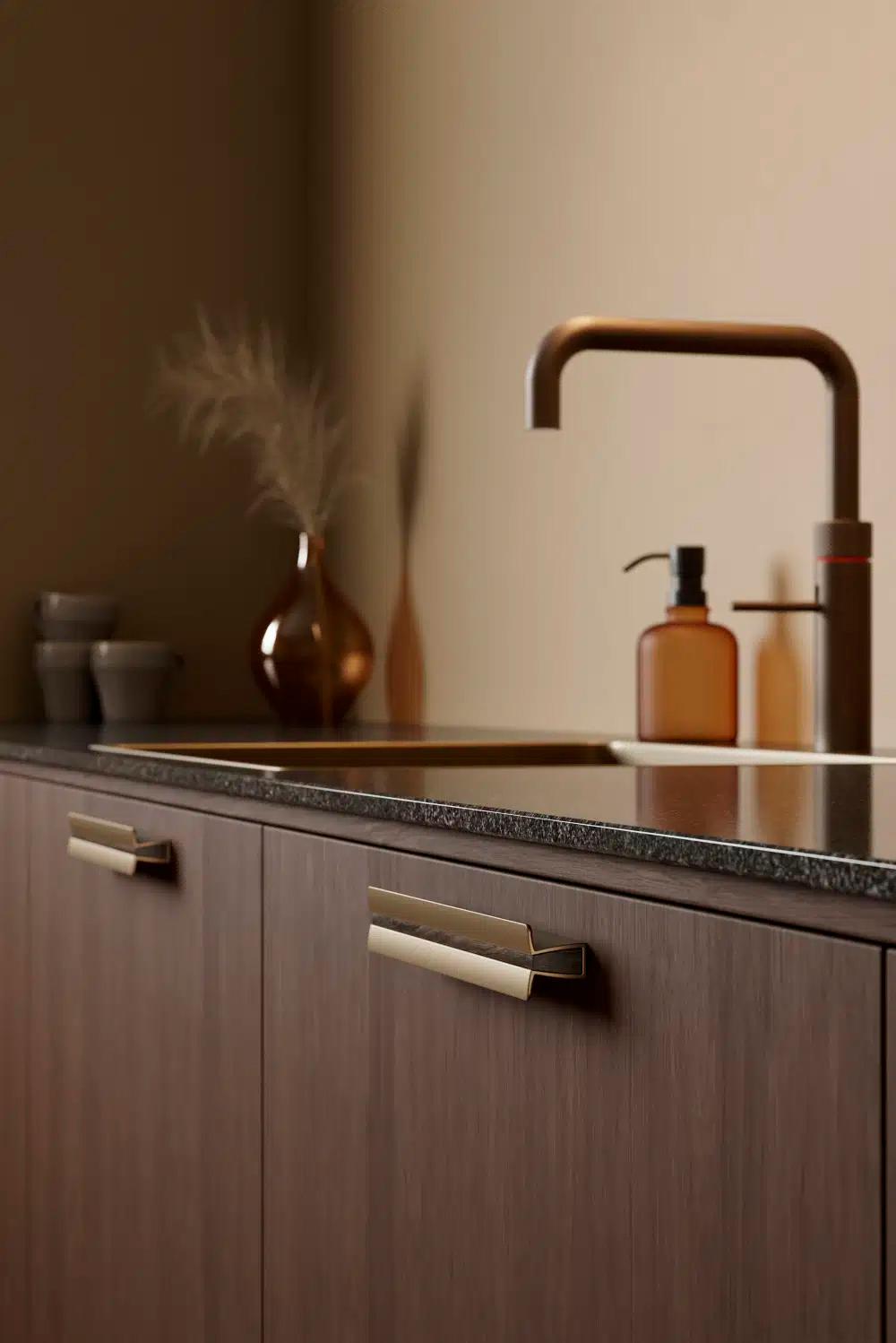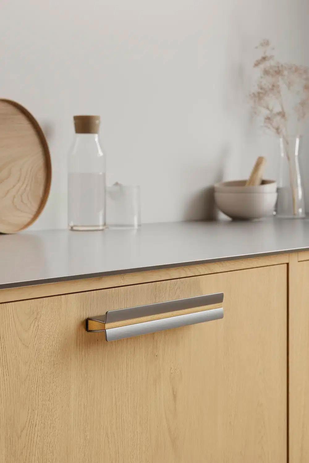 Papillon blev inspireret af ønsket om at designe et luksuriøst greb, der passer til alle fronter i hjemmet. Den dristige form fremhæves af subtile skulpturelle kurver, som skaber et blødt og indbydende design. De ydre metalliske, vingeformede elementer ser ud til at svæve i rummet, mens de visuelt er forankret af det kontrasterende centrale træelement.