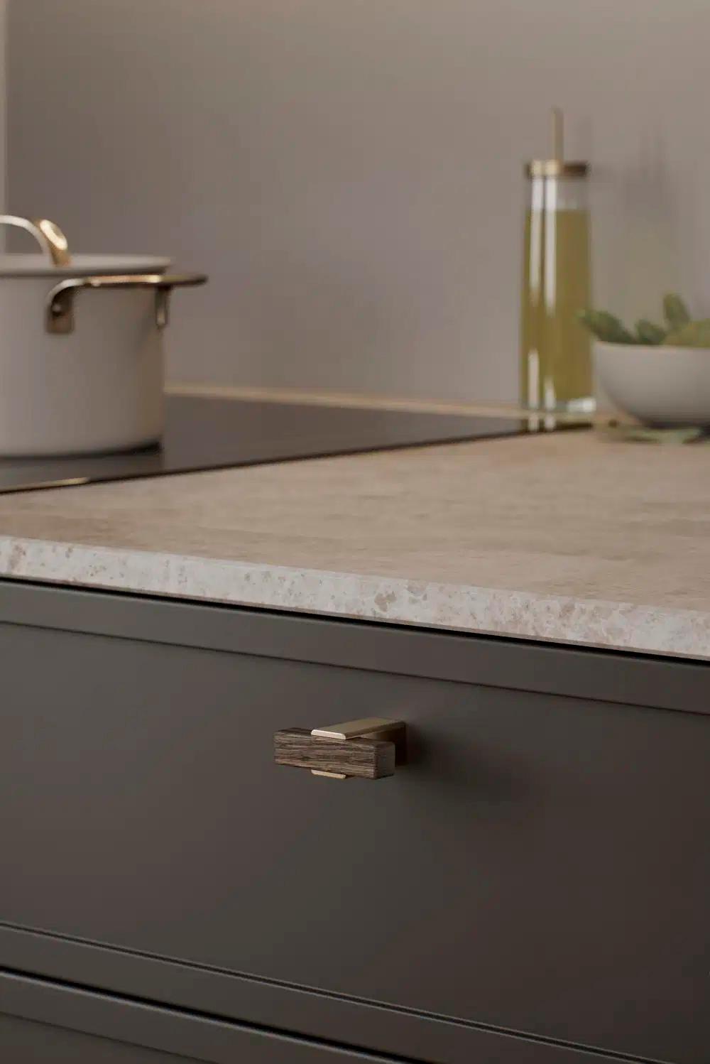 Segment skaber et segmenteret udtryk, hvor et materialeskift fremhæver grebet og giver den trædelte del en næsten ophøjet tilstedeværelse. Dette greb udtrykker styrke og elegance gennem sine støbte beslag, hvilket giver et fint og raffineret greb med en let reference til industriel design.